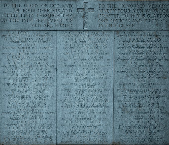 G A Owen age 36 201273 Act. Chief Petty Officer RN F Rhodes age 25 M/2451 Shipwright 2nd Cl. RN G C Robson age 19 ss/117718 Stoker 1st Class RN T Scorer age 24 K/51313 Stoker 2nd Class RN F W Shadwell age 26 M/10909 Eng. Room Artfcr. 3rd RN A B Shaw age 28 M/22794 3rd Writer RN F W Simpson age 30 M/32151 A/Eng.Room Artfcr.4th RN M Small age 19 K/51318 Stoker 2nd Class RN T Smith K51330 Stoker 2nd Class RN T Stamp 191430 Stoker Petty Officer RN C A Starkey age 29 K3796 Stoker Petty Officer RN W Stenson age 39 K/44005 Stoker 1st Class RN G Stubbs age 19 K/51329 Stoker 2nd Class RN M Sullivan age 28 M/2503 Shipwright 2nd Cl RN G H Taylor age 35 298837 Stoker 1st Class RN M Waugh age 19 K/51444 Stoker 2nd Class RN J J Whitington age 17 L/10879 Boy Servant RN J Wills age 21 K51320 Stoker 2nd Class RN R MCG Wray age 27 K/14212 Act Leading Stoker RN