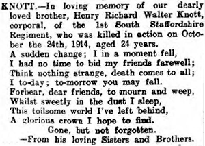 been buried in a trench rushed by the Germans at La Bassee. He was 24.He is commemorated on Le Touret
