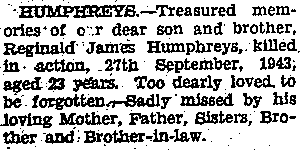 Reginald was 23 when he was reported missing and then as having been killed in action on 27 September 1943.