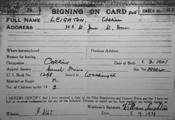 card above, signing-on card for colliery worker, signed by William