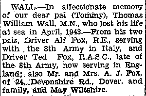 and Thomas William Wall, M.N. killed at sea, April 1943.