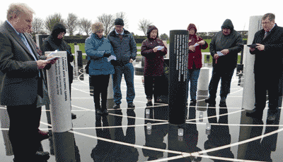 Right, in blustery wet weather, are some of the participants around the Holocaust column. The words on the column are taken